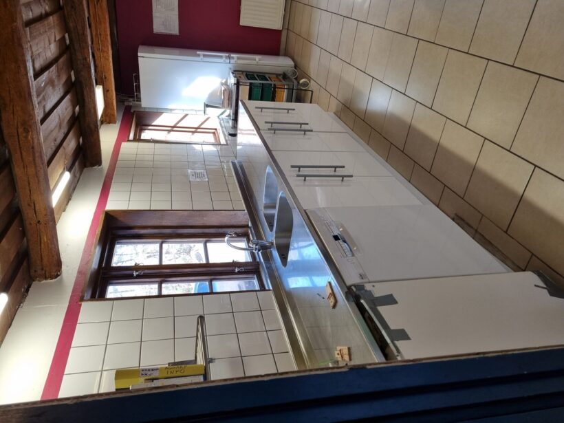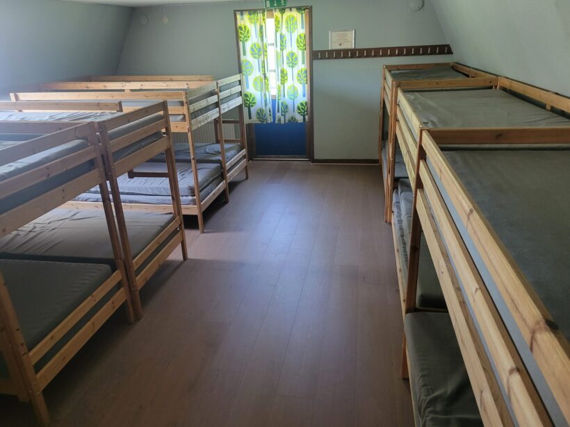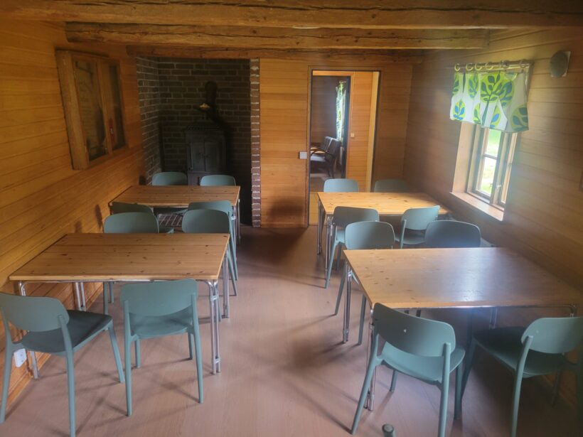 Här finns en sovsal med 15 våningssängar & madrasser (inga sängkläder)+ några extra för golvförläggning, ett stort kök: med 2 kylar och spisar, diskmaskin, servis för ung 30, matsal för ca 30 pers, ledarrum med soffgrupp och eldstad, stora salen med öppen spis och bord/stolar för ca 60 pers, dubbla omklädningsrum med duschar och flera toaletter. Bastun kan användas efter överenskommelse. Vindskydd med eldplats.