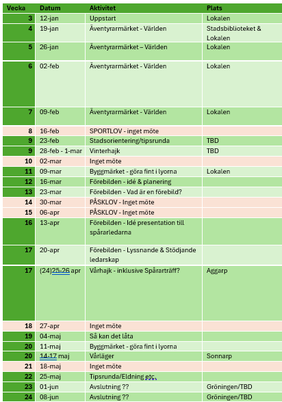 Vid snabba ändringar om mötesplats eller liknande så går vi ut i WhatsApp gruppen vi har och försöker i den mån det är möjligt även updatera nedanstående.